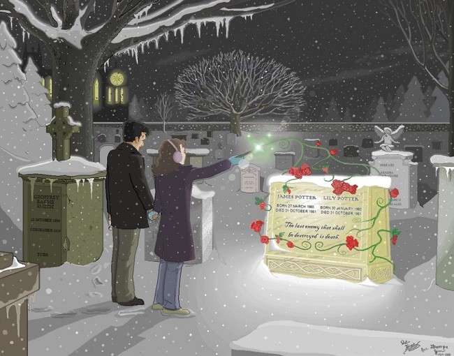 Một bức khác từ bộ truyện Harry Potter. Toàn bộ được tạo ra bằng MS Paint trừ phần bản in trên bia mộ mà Hines sử dụng Photoshop.