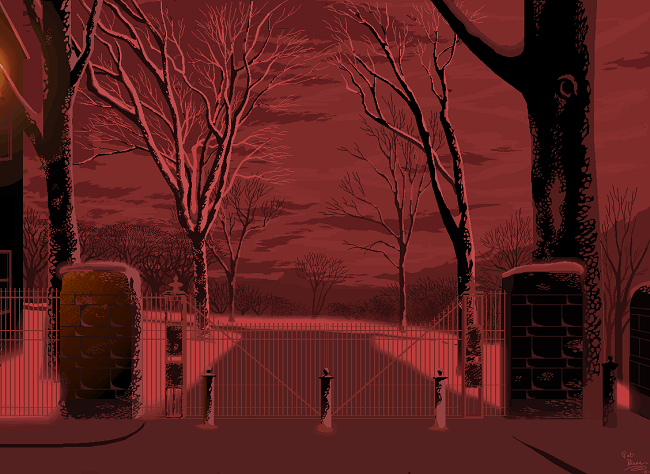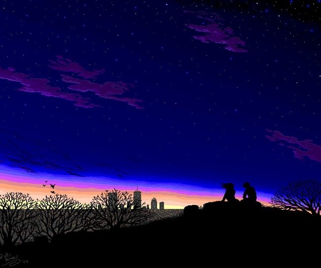 Hines bắt đầu bằng cách đặt một số hình dạng đơn giản trong MS Paint, sau đó tô màu chúng và phóng to hình ảnh để có độ phân giải cao hơn. Cảnh dưới đây được dựa trên Peter's Hill ở Boston.